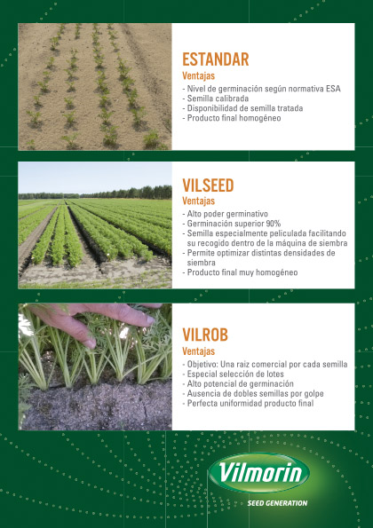 - VILROB ha sido concebida con el objetivo 'una semillla-una raíz' y los lotes han sido especialmente seleccionados, evitándose las 'dobles semillas' por 'golpe', y da lugar a un producto final con perfecta uniformidad. Además se trata de una semilla mini-pelletizada o mini-pildorada, buscando que las semillas tengan un tamaño homogéneo , lo que favorece una siembra uniforme.